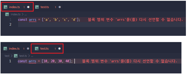 분명 별개의 파일이라 이름이 겹쳐도 상관없을 거라 생각했지만, 타입스크립트에서는 파일 자체가 (심지어 파일 경로가 달라도) 전역 스코프로 취급됨을 볼 수 있다.