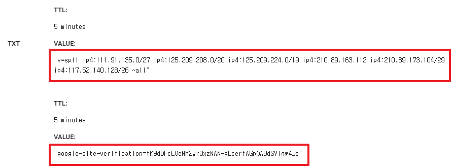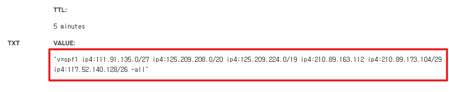 TXT 레코드에 간단한 정보 메모를 해도 되지만, 다음과 같이 SPF 레코드를 기재하는데 많이 이용된다.